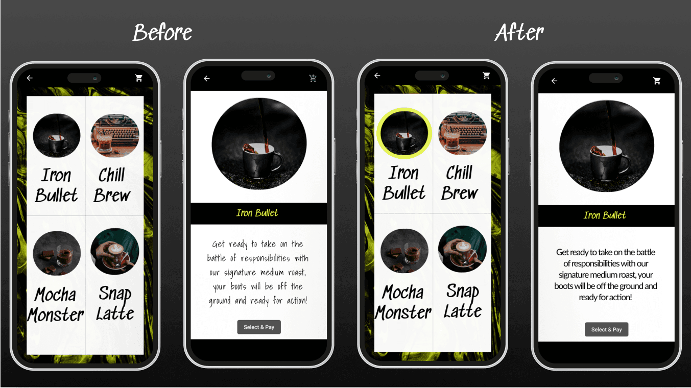 To address this issue, Daniel created a menu of different items to browse, but only a few were actually clickable for the prototype demo to complete the journey. To improve the situation, he created a highlighted circle to show visual indication of what is clickable. He also made changes to the description text of each item to increase readability. After incorporating these changes, the product was ready for handoff and was transferred to a developer for review in Zeplin.