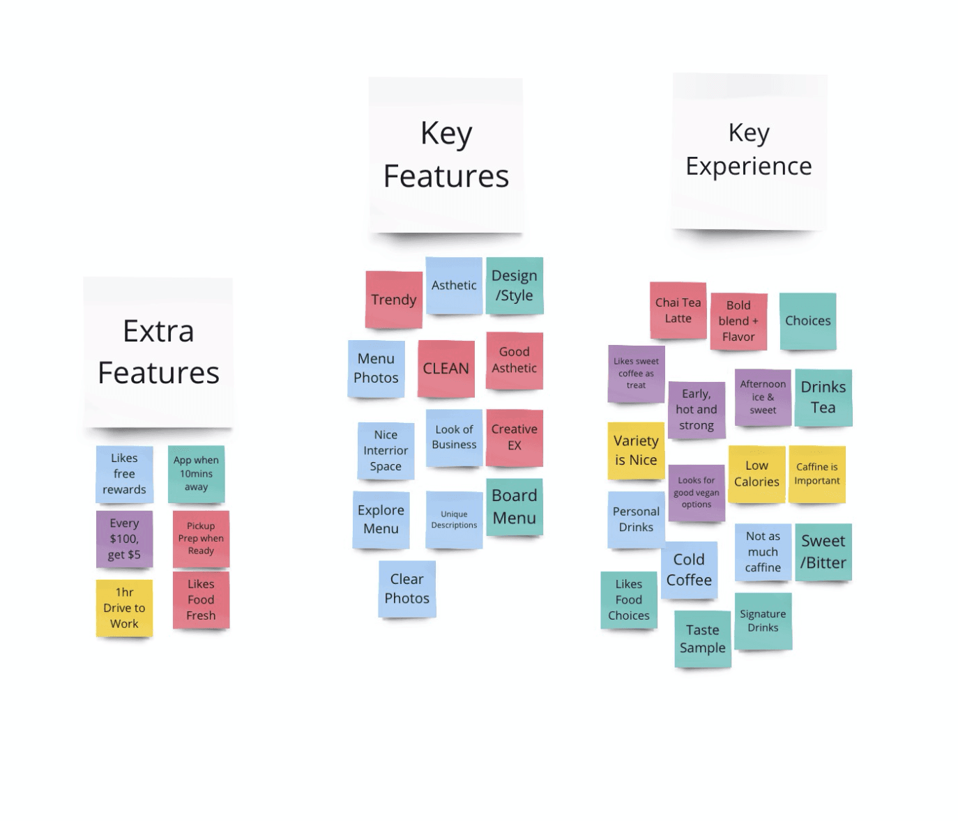 Examining the information gathered through research and analysis. Daniel analyzed the observations to understand what core features and experiences caused these users to keep coming back to these locations for their coffee. What certain features or experiences do they look for when trying a new product for the first time?